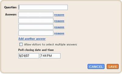 Tiện ích này mới được bổ sung gần đây nhất giúp bạn thăm dò ý kiến người đọc về một đề tài nào đó. Để sử dụng bạn click Add to Blog và điền câu hỏi ( Question ), trả lời ( Answer ), thay đổi ngày kết thúc thăm dò và bấm lưu ( Save ). Nếu bạn muốn thêm trả lời thì click Add another answer và để xóa bớt thì click vào remove. Để người đọc được phép chọn nhiều câu trả lời cùng lúc hãy chọn Allow visitors to select multiple answers.