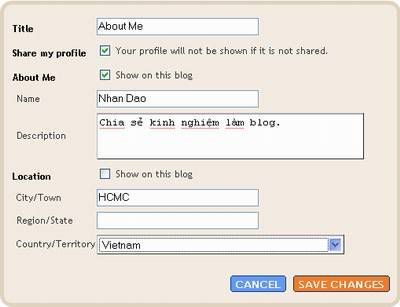 -Share my profile: Chọn để chia sẻ hồ sơ.-About Me: Chọn để hiển thị trên blog