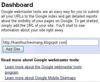 Bạn sẽ đến trang quản lý Dashboard. Tiếp tục gõ đầy đủ liên kết của blog bao gồm cả “http://” trong box Add site (hình 2) . Ví dụ tôi sẽ gõ liên kết trang của tôi: http://kienthuctrenmang.blogspot.com sau đó bấm OK.