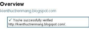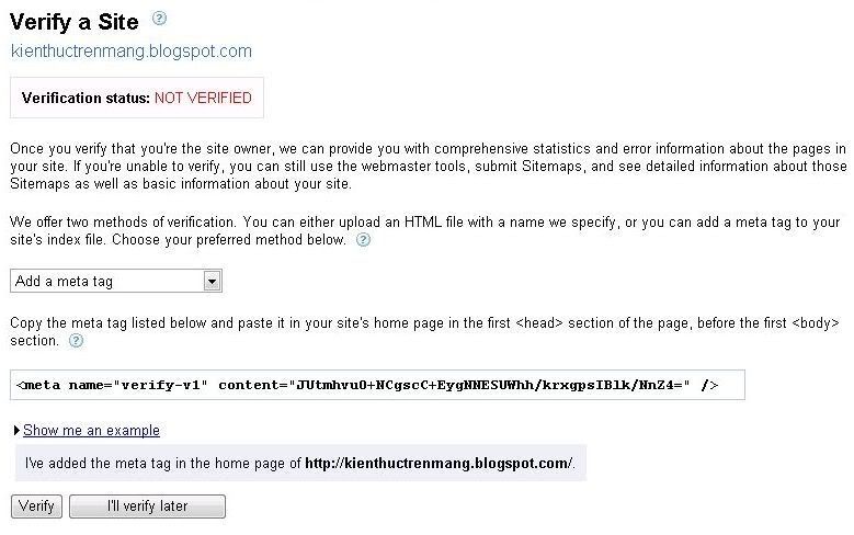 Click vào Choose verification method để chọn phương pháp kiểm tra. Bạn chọ Add a META tag sau đó copy đoạn mã bên dưới nó (hình 3) đăng nhập vào blog, chọn Edit HTML ( Template->Edit HTML ) paste vào bất kỳ chỗ nào giữa hai cái tag ( Bạn có thể paste như hình 4 ) và lưu lại. Trở lại trang Webmaster tool của Google click vào button Verify để kiểm tra và bạn sẽ được thông báo thành công (hình 5)